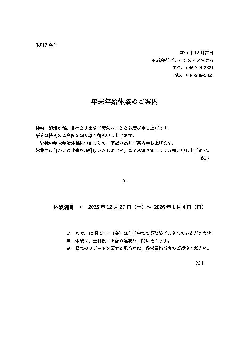 ※ なお、12月26日(金曜)は午前中での業務終了とさせていただきます。